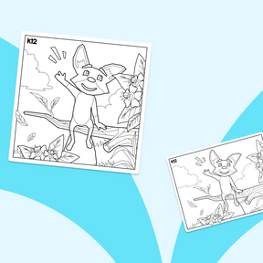 Adventure awaits! In this playful outdoor scene, Strider is perched on a tree branch surrounded by flowers, leaves, and nature. This cheerful coloring page invites students to explore the outdoors through creativity and color.